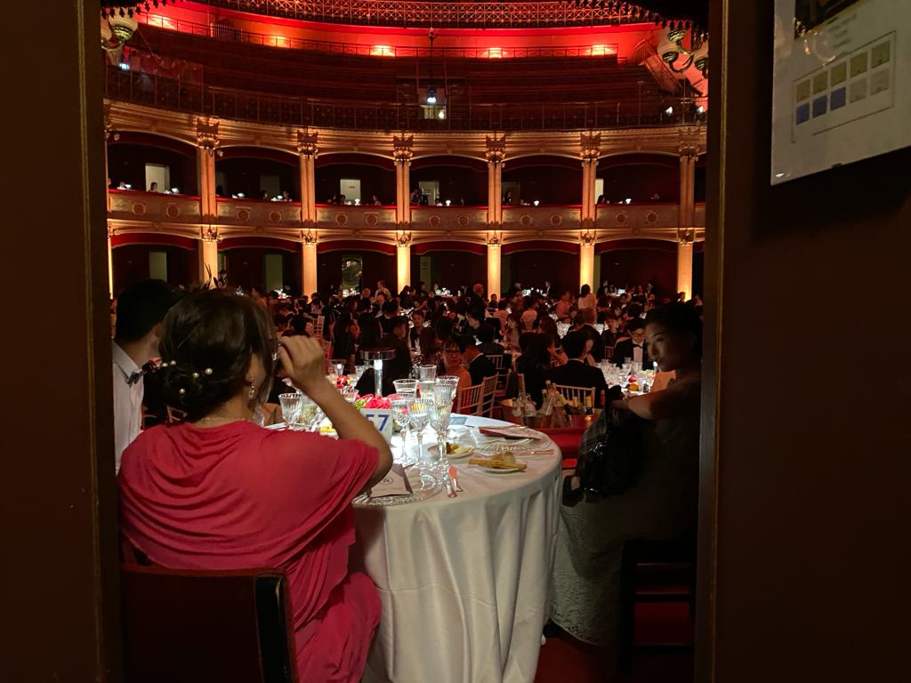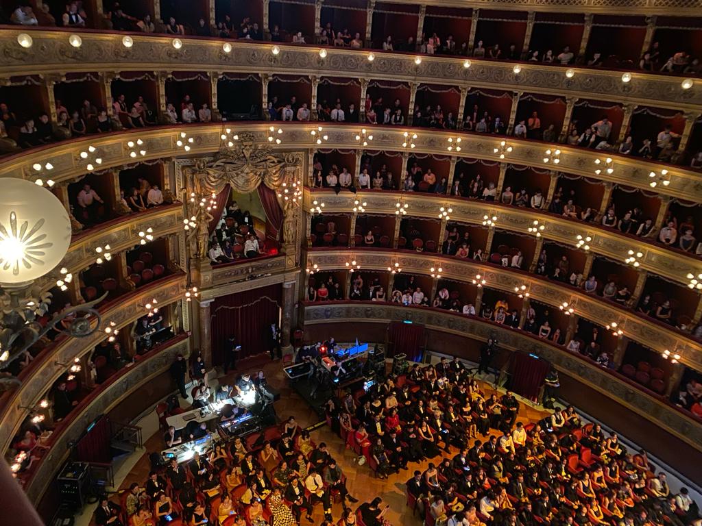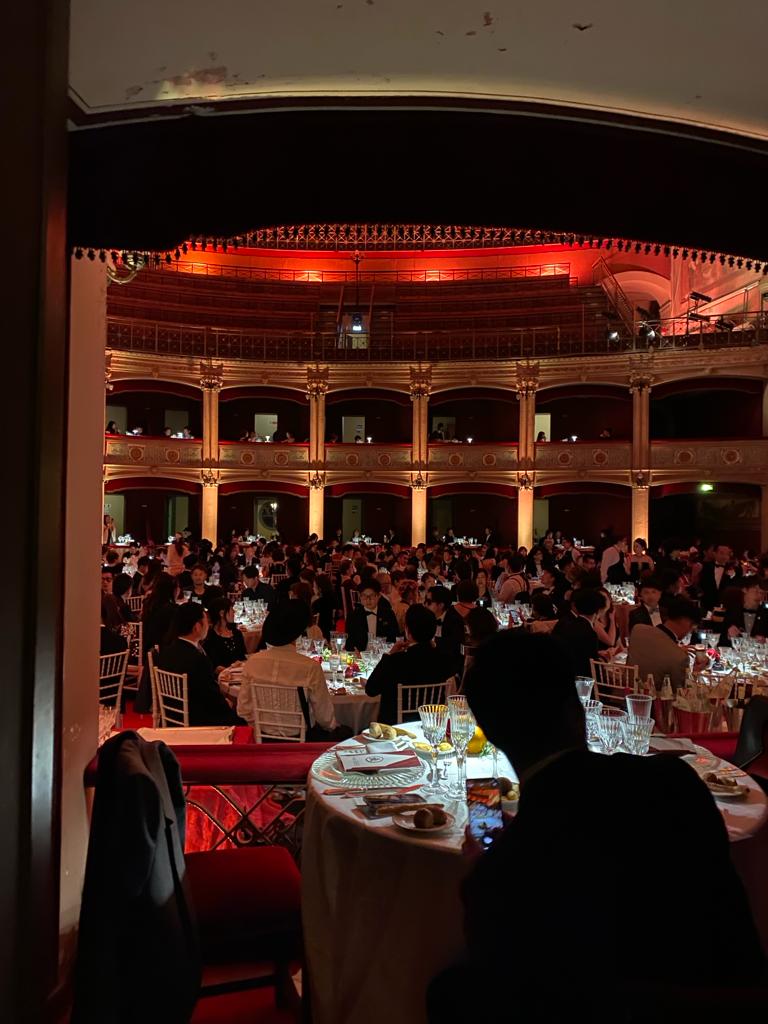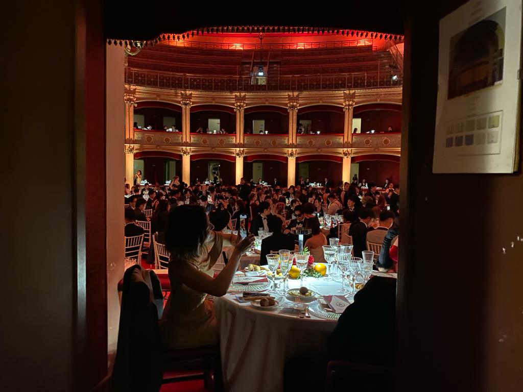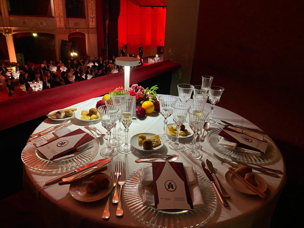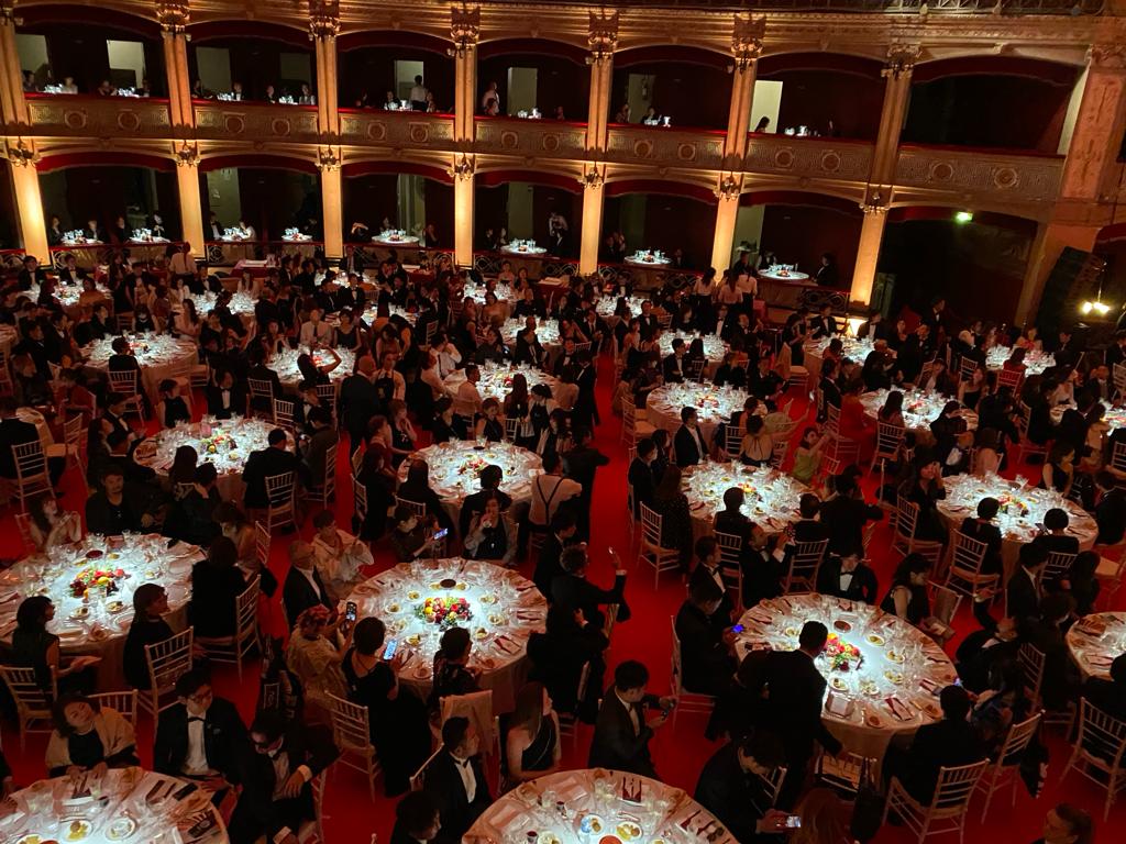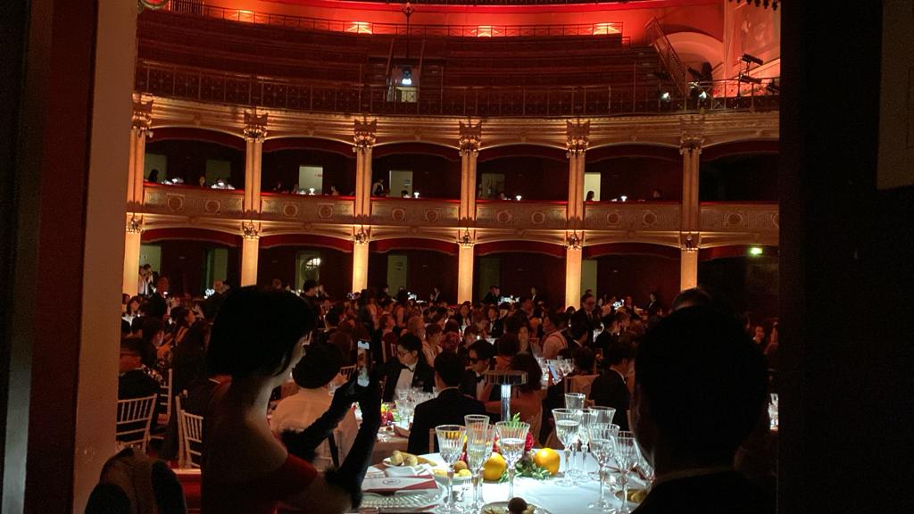 Infine la grande cena con il teatro Politeama letteralmente “smontato” (tutto sarà ripristinato entro mezzanotte), il tavolo di Nakajima allestito nel palco d’onore e tutto il teatro, dalla sala alle tre file di palchi, divenuto un grande elegante ristorante mentre le cucine mobile erano montate all’esterno. Lì lo staff di patron Bartolo Galati ha lavorato incessantemente fino a tarda ora