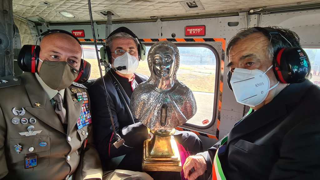 E oggi a bordo di un elicottero dell’esercito l’arcivescovo ha sorvolato la città con la reliquia della Santuzza e ha benedetto i palermitani. Con lui il sindaco Leoluca Orlando ed il generale dell’Esercito in Sicilia Maurizio Angelo Scardino è partito da Boccadifalco e ha sorvolato il cielo del capoluogo con un elicottero messo a disposizione dall’Esercito. All’interno del velivolo, sulle ginocchia dell’arcivescovo, la reliquia argentea raffigurante Santa Rosalia ha benedetto dall’alto i palermitani.