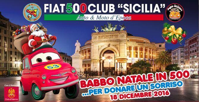 “Babbo Natale in 500 per donare un sorriso” è la manifestazione, giunta alla sua seconda edizione, in programma a Palermo domenica 18 dicembre, su iniziativa del “Fiat 500 club Sicilia”, club di soci collezionisti di 500 storiche che si spendono per il sociale.