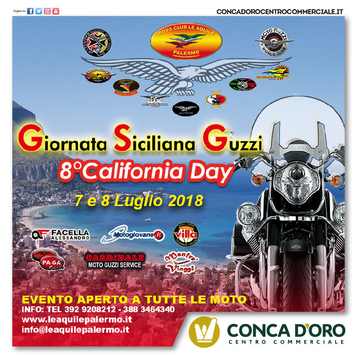 Moto Guzzi e California, ma non solo. Il centro commerciale Conca D’Oro accoglie l’ottava edizione del “California Day”. Sabato 7 (dalle 17 alle 20), e domenica 8 luglio (dalle 9 alle 19), appuntamento in via Lanza di Scalea per appassionati, curiosi e amatori delle due ruote con il raduno Moto Guzzi. L’evento, organizzato dal “Moto Club Le Aquile Palermo” è aperto a tutti i tipi di moto.