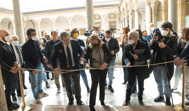 Ad accogliere i giornalisti in piazza del Parlamento i versi “Mai più tornerò sui miei passi” dell’attivista afghana Meena, trucidata nel 1987, ad anticipare il clima di rabbia impotente di fronte alle immagini che si dispiegano all’interno. Un gigantesco cerchio campeggia sul prospetto di Palazzo, simbolo dell’uguaglianza, della vita, della morte, della rinascita.