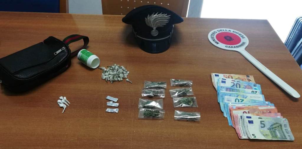 Nel corso della perquisizione in un borsello sono stati trovati 318 euro, in banconote e 89 dosi tra crack, hashish, marijuana e cocaina. Il denaro e la droga sono stati sequestrati.