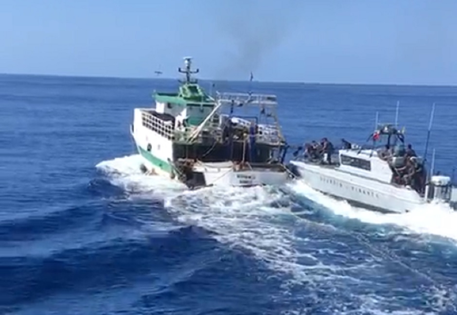 Durante l’inseguimento, durato alcune ore e filmato da velivoli del comando operativo aeronavale e dell’agenzia europea Frontex, nonostante l’esplosione di alcuni colpi a scopo intimidatorio da parte dell’unità maggiore, il peschereccio non solo non consentiva l’abbordaggio, ma metteva in atto una serie di manovre che hanno messo in pericolo l’incolumità degli stessi militari che cercavano di salire.