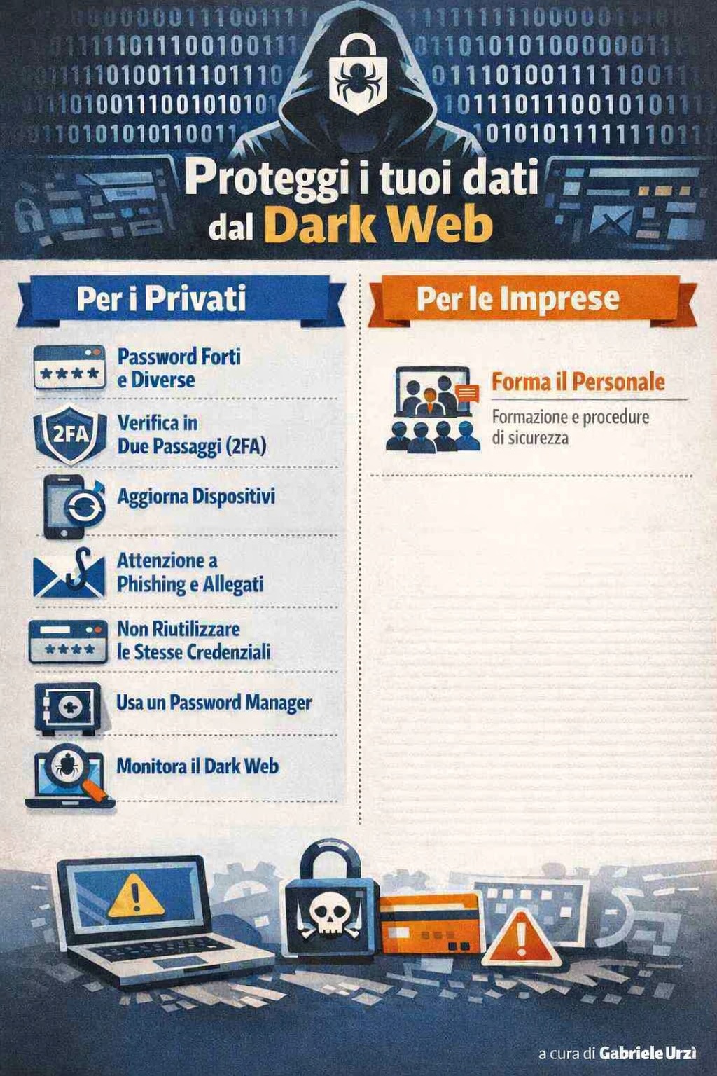 “Le credenziali rubate possono essere utilizzate per diversi scopi, ad esempio per entrare negli account delle vittime, utilizzare servizi in modo fraudolento, inviare messaggi con richieste di denaro o link di phishing, diffondere malware o ransomware per estorcere o rubare denaro. In questo scenario, il “fattore umano” continua a giocare un ruolo cruciale: la disattenzione degli utenti e l’uso di password deboli o riutilizzate sono infatti tra le cause più comuni. Il modo più efficace per difendersi dal rischio di vedere i propri dati finire sul dark web è adottare comportamenti digitali più consapevoli. Oggi i criminali informatici utilizzano tecniche sempre più sofisticate, spesso potenziate dall’intelligenza artificiale, ma una parte rilevante delle violazioni nasce ancora da disattenzioni evitabili. È fondamentale utilizzare password complesse e diverse per ogni servizio, attivare la verifica in due passaggi, aggiornare i dispositivi e non cliccare su link o allegati provenienti da mittenti sconosciuti. Anche le imprese devono rafforzare le proprie procedure interne, perché gli attacchi sempre più spesso colpiscono i profili professionali. La sicurezza digitale non è un tema tecnico riservato agli addetti ai lavori: riguarda tutti noi. Ogni cittadino e ogni azienda devono considerare la protezione dei dati come una parte essenziale della propria sicurezza quotidiana.”