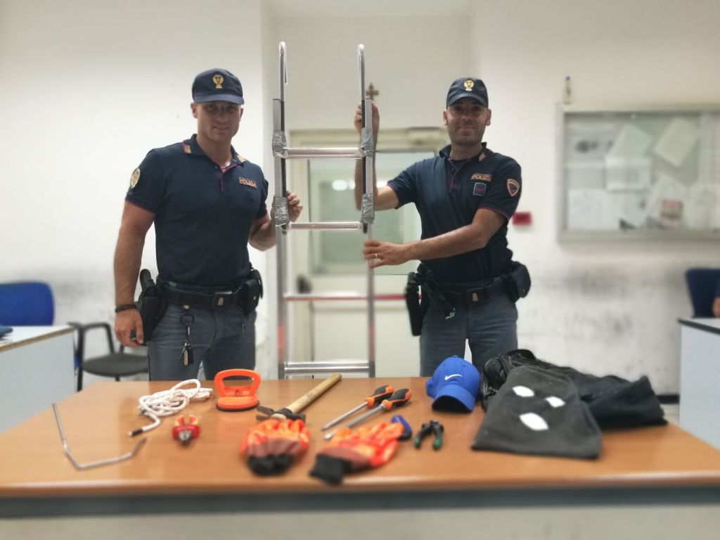 L’uomo, prima di venire raggiunto dagli agenti, aveva goffamente tentato di occultare tra le siepi, uno zainetto contenente cacciavite, pinze, funi, tronchessa, martello e guanti.
