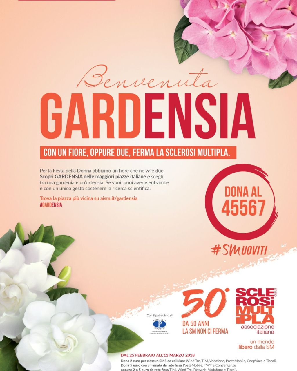Il 3, il 4 e l’8 marzo, per la Festa della Donna, in 5.000 piazze italiane, 10 mila volontari invitano a scegliere (con un contributo minimo di 15 euro l’una) una pianta di gardenia o una di ortensia, o entrambe, per sostenere la ricerca e l’assistenza, due facce della stessa medaglia: l’impegno a fianco delle persone. I due fiori sottolineano lo stretto legame tra le donne e la sclerosi multipla (SM), che colpisce la popolazione femminile in misura doppia rispetto agli uomini. Ogni giorno, in Italia, 5 donne ricevono una diagnosi di sclerosi multipla.