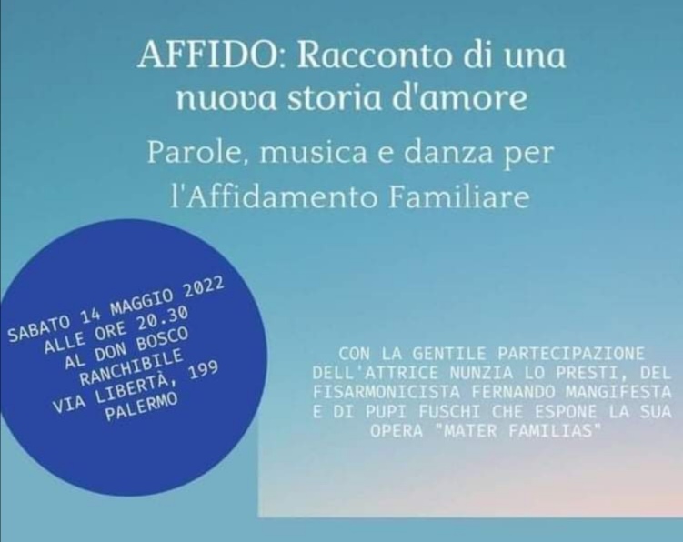 Al teatro Don Bosco Ranchibile di Palermo in programma “Affido: racconto di una nuova storia d’amore”. È questo il titolo dell’evento che l’AFAP, Associazione Famiglie Affidatarie Palermo, organizza in occasione della “Giornata Internazionale della Famiglia“. L’appuntamento è in programma per sabato 14 maggio 2022, ore 20.30.