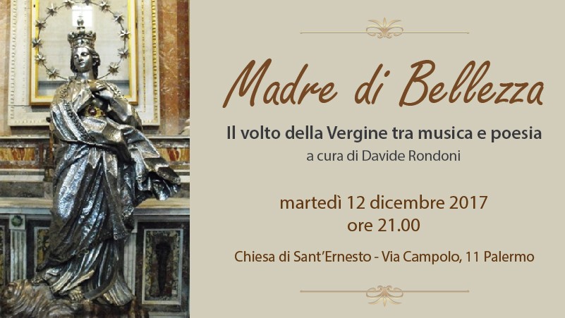 Domani alle 21 nella chiesa di Sant’Ernesto, in via Campolo, 11 a Palermo si terrà uno spettacolo dal titolo: “Madre di Bellezza. Il volto della Vergine tra musica e poesia”.