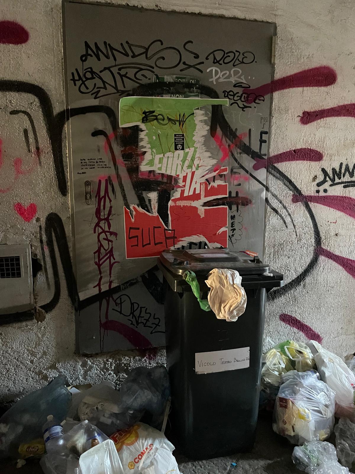 In effetti da un sopralluogo sui luoghi si nota anche, oltre alla presenza di immondizia di tutti i tipi e di rifiuti pesanti e alla pericolosa occlusione ad opera di terzi delle uscite di sicurezza in palese violazione della normativa in materia, l’ostruzione all’accesso dei contatori della luce non solo del teatro ma anche dei palazzi condominiali circostanti.