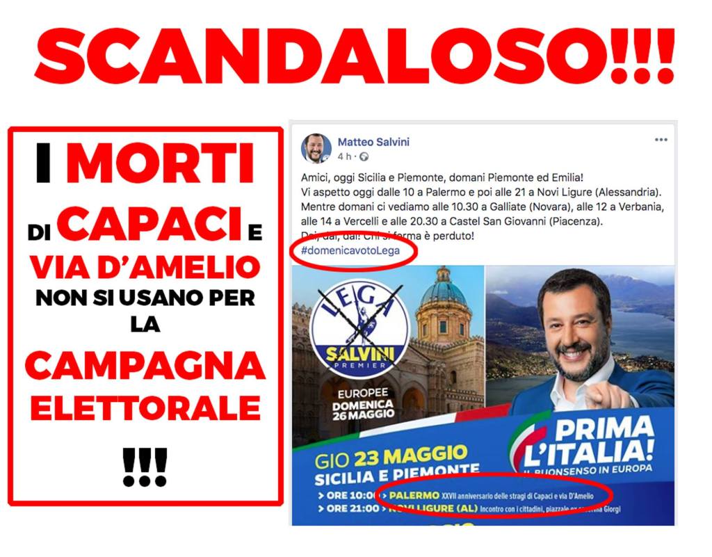 “Scandaloso. I morti di Capaci e via D’Amelio non si usano per la campagna elettorale”. E’ quanto si legge su un fotomontaggio che sta facendo il giro della rete indignando moltissime persone.