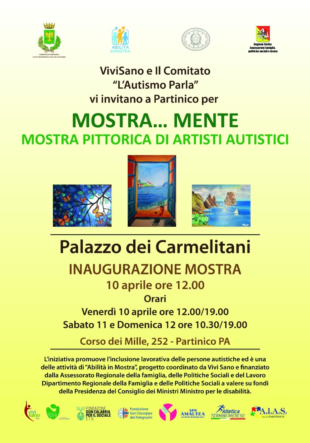 Appuntamento oggi, venerdì 10 aprile alle ore 12.00 a Partinico a Palazzo dei Carmelitani per l’inaugurazione della mostra visitabile durante il fine settimana. L’iniziativa è organizzata in collaborazione con il Comune di Partinico. Saranno presenti al vernissage il Sindaco Pietro Rao e il Vicesindaco e Assessore Dorotea Speciale. Presenti anche Daniele Giliberti, Presidente di Vivi Sano, Daniela Pizzuto Presidente del Comitato L’Autismo Parla e Francesca Avanzato Dirigente dell’AIAS ETS Partinico.