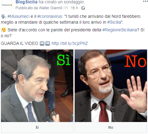 E i dati raccolti da un sondaggio social proposto da BlogSicilia (E’ ancora possibile esprimere la propria opinione votando il sondaggio) sembrano dargli ragione. Su oltre 2000 voti espressi dai lettori di BlogSicilia in poche ore circa il 75%, i tre quarti, concordano con il Presidente della Regione e considerano l’invito fatto agli italiani del Nord che si trovano nelle zone gialle del contagio a rinviare il proprio viaggio in Sicilia una scelta saggia nonostante le polemiche e le conseguenze sul turismo e sull’economia dell’isola denunciate dagli operatori del settore