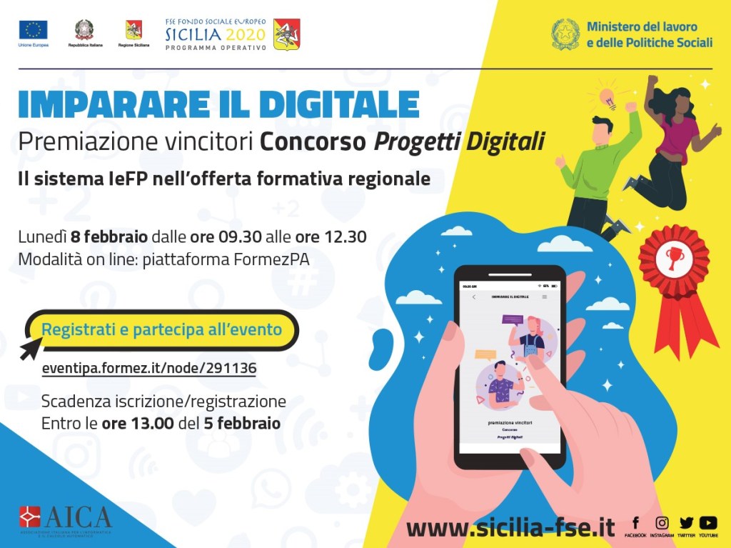 La competizione è promossa dall’Aica, l’Associazione italiana per l’informatica ed il calcolo automatico, con il patrocinio del Ministero del lavoro e delle politiche sociali. Gli istituti siciliani saranno premiati lunedì 8 febbraio nell’ambito dell’evento “Imparare il digitale. I percorsi di istruzione e formazione professionale (IeFP) nell’offerta formativa della Regione Siciliana”, organizzato dall’Assessorato dell’Istruzione e della Formazione professionale della Regione Siciliana in collaborazione con Formez PA, nell’ambito delle attività di comunicazione del PO-FSE Sicilia 2014-2020.