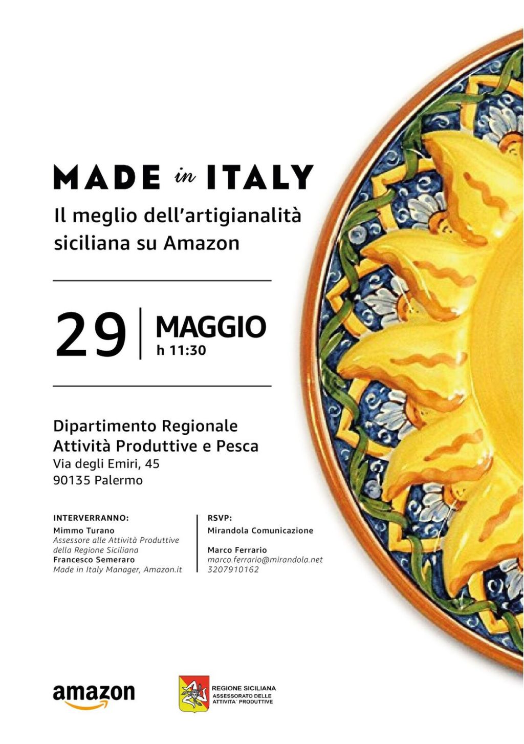 Martedì 29 maggio alle ore 11,30 a Palermo nella sala conferenze dell’Assessorato Attività produttive (via degli Emiri, 45), l’assessore Mimmo Turano e il Made in Italy manager di Amazon Italia Francesco Semeraro presenteranno il progetto “Made in Italy. Il meglio dell’artigianalità siciliana su Amazon”.