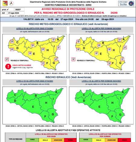 Anche per la giornata odierna, così come dal pomeriggio di ieri, allerta gialla in tutte e nove le province della Sicilia per mercoledì 28 agosto per piogge e temporali. Lo si legge nell’avviso della protezione civile 24240 sul rischio meteo idrogeologico e idraulico.