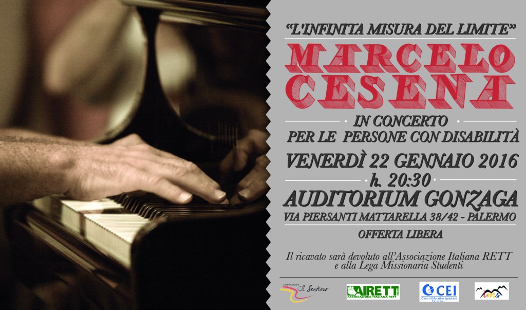 Venerdì 22 gennaio 2016 alle ore 20,30 nel corso della sua tournée in Sicilia il pianista Marcelo Cesena terrà un concerto a favore delle persone con disabilità, dal titolo: ‘L’infinita misura del limite’. Si svolgerà all’Auditorium Gonzaga di Via Piersanti Mattarella 38/42 a Palermo. L’iniziativa è promossa dal Centro Culturale Il Sentiero e dal Centro Educativo Ignaziano. Il ricavato sarà devoluto all’Associazione Italiana RETT e alla Lega Missionaria Studenti.