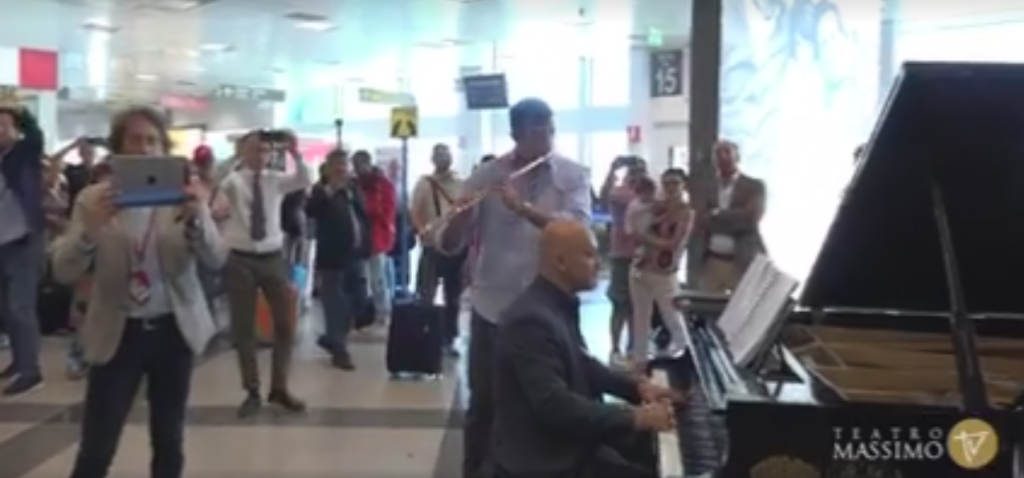 Con la celebre “Libiamo ne’ lieti calici” da La Traviata hanno salutato Palermo per partire alla volta del Giappone. Un flashmob dell’Orchestra e del Coro del Teatro Massimo all’aeroporto Falcone-Borsellino che ha sorpreso e divertito i viaggiatori di passaggio, che hanno scattato fotografie e girato video riprendendo i 150 artisti che suonavano e cantavano.