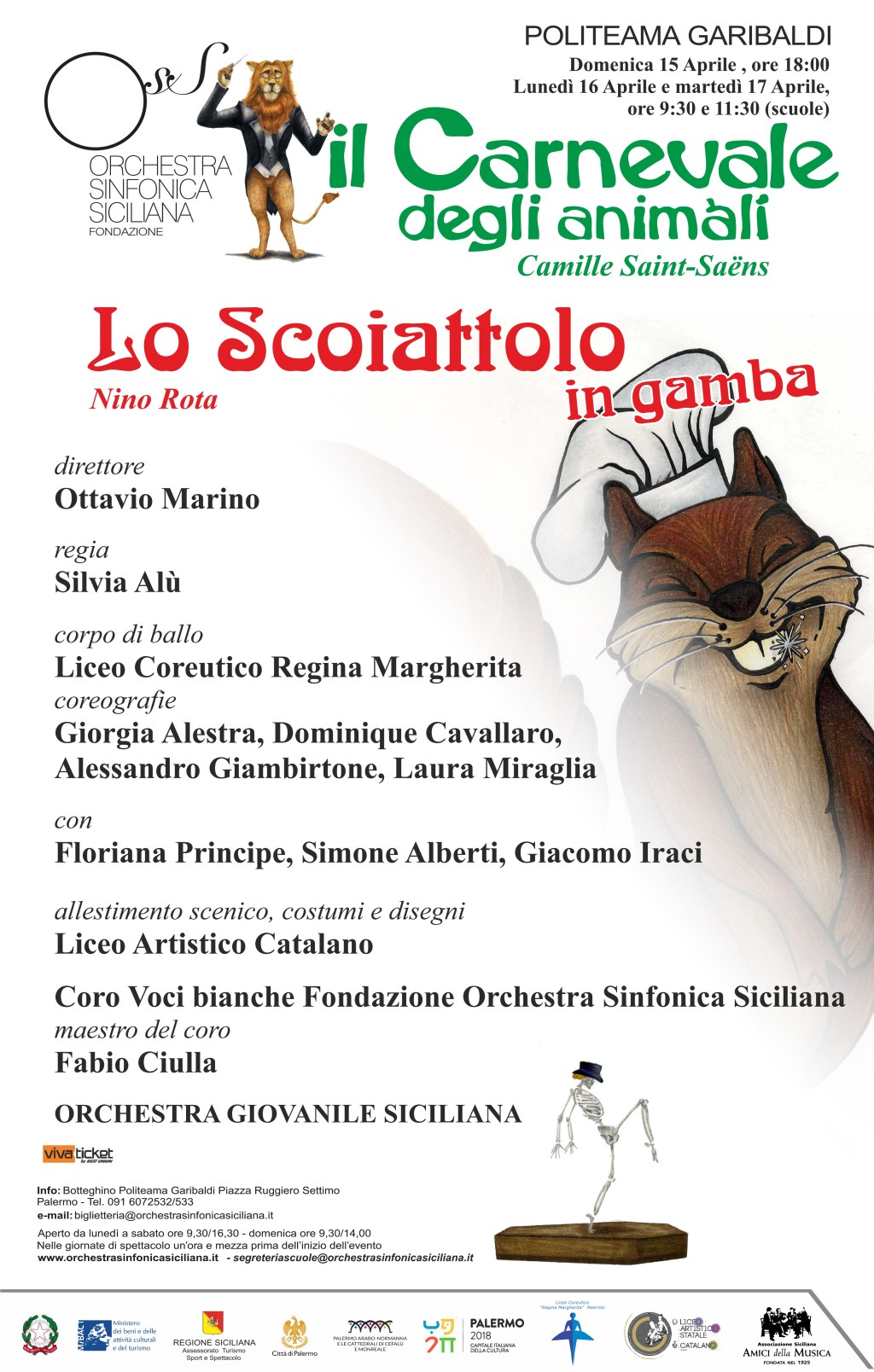 Ultimo appuntamento di La Scuola a Teatro al Politeama Garibaldi. Debutto domenica 15 aprile alle ore 18 per Il Carnevale Degli Animali di Camille Saint-Saëns e Lo Scoiattolo in gamba di Nino Rota. Sul podio, a dirigere l’Orchestra Giovanile Siciliana, Ottavio Marino, regia di Silvia Alù. In scena circa 150 artisti. Ci saranno infatti anche il corpo di ballo del Liceo Coreutico Regina Margherita, il Coro Voci bianche della Fondazione Orchestra Sinfonica Siciliana, diretto da Fabio Ciulla: Le coreografie sono di Giorgia Alestra, Dominique Cavallaro, Alessandro Giambirtone, Laura Miraglia, allestimento scenico, costumi e disegni del Liceo Artistico Catalano.