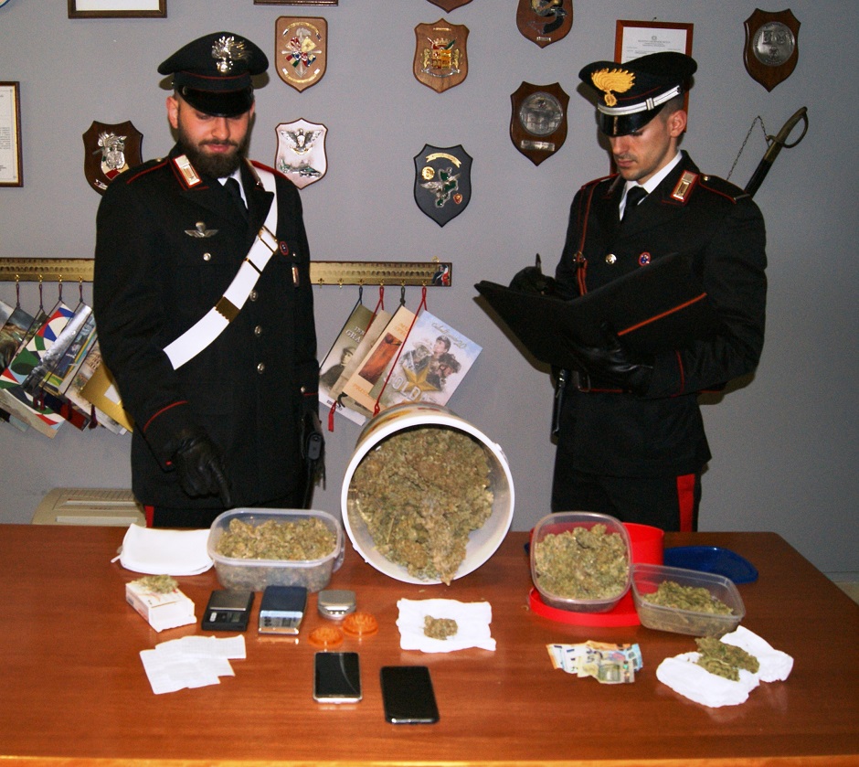 Il padre del giovane, denunciato, ha tentato di disfarsi della droga gettandola dal balcone. Sono stati trovati in casa anche i bilancini di precisione.