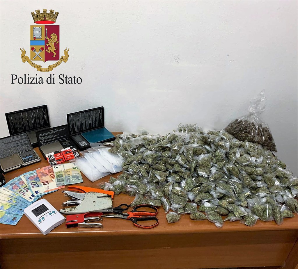 Nell’appartamento sono state trovate 290 dosi di marijuana confezionate in bustine, 4 bilancini di precisione, un termometro digitale, materiale per il confezionamento dello stupefacente e 270 euro in banconote.