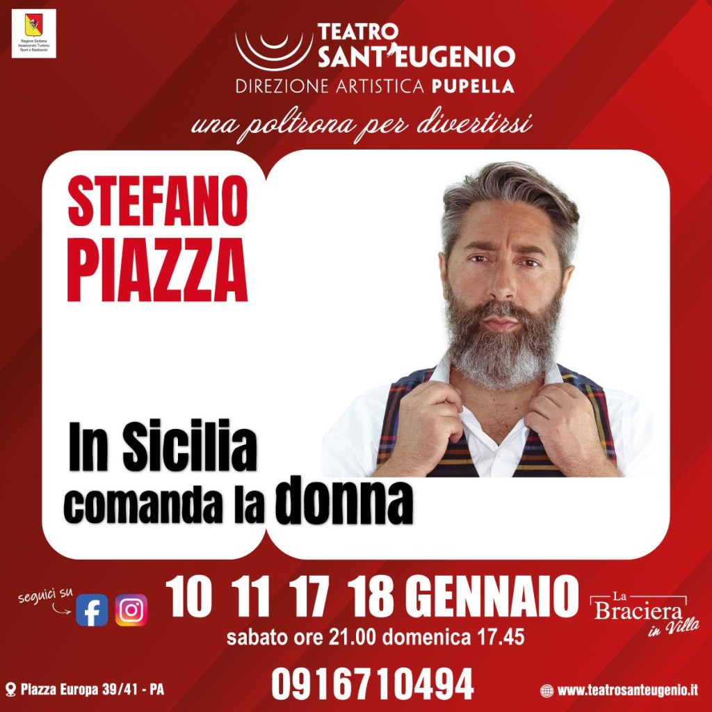 “Una poltrona per divertirsi”, la Stagione 2025-2026 del teatro Sant’Eugenio di Palermo, prosegue ed apre il nuovo anno con un imperdibile Stefano Piazza che, il 10 e 11 gennaio, e poi il 17 e 18 gennaio, porterà in scena il suo divertentissimo spettacolo “In Sicilia comanda la donna” che sarà in programma nel teatro diretto dalla famiglia Pupella, di piazza Europa 39/41 a Palermo, il sabato alle ore 21, e la domenica alle ore 17.45 (eccezionalmente, domenica 18 gennaio, l’inizio è posticipato alle ore 20.30 per la concomitanza della partita in casa del Palermo).