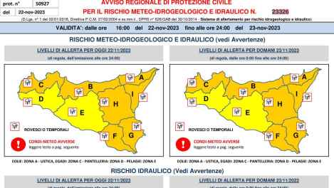 La nota parla anche di condizioni meteo avverse: “Dal tardo pomeriggio-sera di oggi, mercoledì 22 novembre, e pe le successive 18-24 ore si prevedono: piogge e temporali sparsi, specie sui settori meridionali e ionici. I fenomeni saranno accompagnati da rovesci di forte intensità, frequente attività elettrica e forti raffiche di vento”.