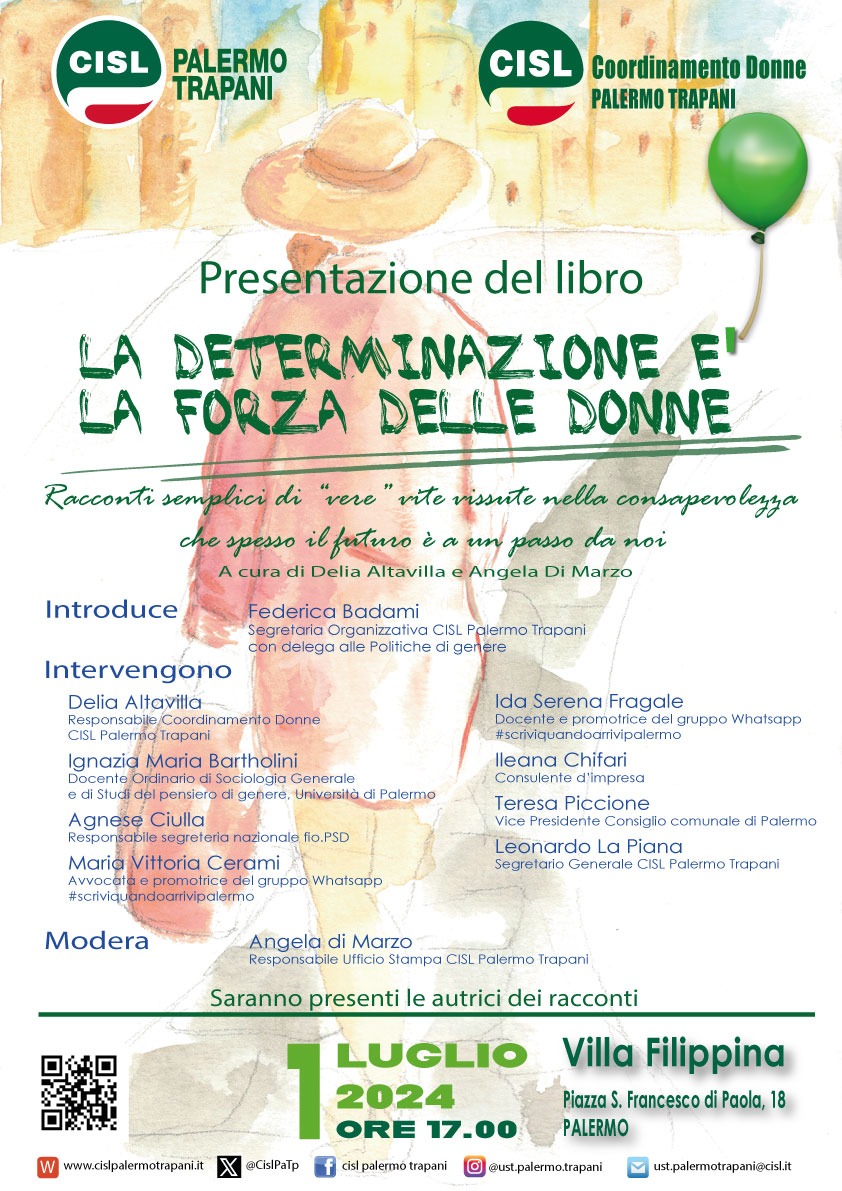 Storie di vite in salita, in fuga dalla povertà, dalla violenza fisica e psicologica, di realizzazione di sé attraverso il lavoro, la famiglia, l’integrazione sociale, di sogni infranti e di progetti realizzati, con un unico denominatore: la determinazione delle donne. C’è questo e altro nel libro “La determinazione e (è) la Forza delle Donne”, a cura di Delia Altavilla e Angela Di Marzo, che contiene una raccolta di racconti nata da un progetto del Coordinamento Donne della Cisl Palermo Trapani e che sarà presentato il prossimo lunedì 1 luglio alle 17 a Villa Filippina a Palermo.