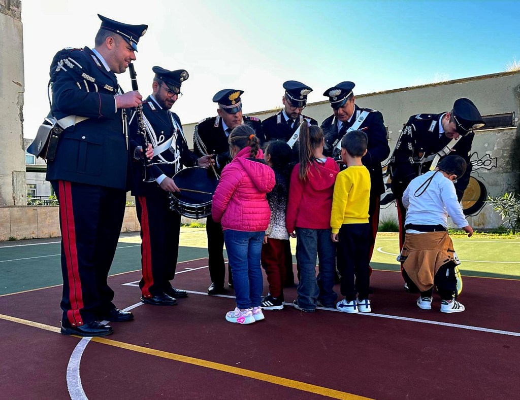 La fanfara dei carabinieri del 12 reggimento Sicilia si è esibita nel cortile dell’istituto comprensivo Giovanni Falcone, nel quartiere “Zen 2” di Palermo, davanti ai bambini e i loro insegnanti.