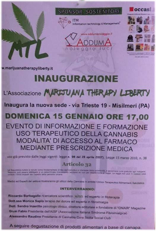 Domenica 15 gennaio l’associazione Marijuana therapy liberty inaugurerà alle ore 17 la propria sede a Misilmeri in via Trieste n°19.