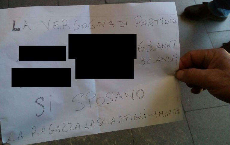 Succede, come detto, a Partinico. ad annunciare le nozze fra sua moglie e l’amante è il marito che distribuisce un volantino scritto a mano con nome e cognome di lui e di lei. la vicenda la racconta Partinico Live. Sessantatre anni lui, 32 lei è la ‘vergogna di Partinico’, scrive l’uomo abbandonato che sottolinea come lasci, oltre al marito, anche due figli.