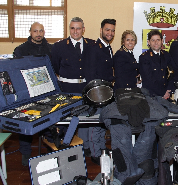 Nello stand allestito all’interno della palestra dell’istituto, personale del nucleo Artificieri, Sommozzatori e Cinofili della Questura hanno mostrato agli interessati studenti il vasto “campionario” di attrezzature e strumenti tecnici di rispettiva pertinenza.