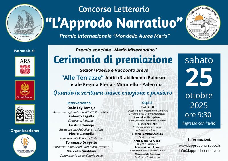 La prima edizione del Concorso Letterario Nazionale “L’Approdo Narrativo”, organizzato dall’Associazione Culturale Rigatonidea – www.rigatonidea.it -, approda alla sua conclusione con la cerimonia di premiazione, prevista per sabato 25 ottobre alle ore 9:30, nella suggestiva sala “Alle Terrazze” dell’Antico Stabilimento Balneare di Mondello a Palermo. L’iniziativa, inserita nel progetto “Mondello Aurea Maris” – www.mondelloaureamaris.it -, celebra la creatività emergente nelle forme di Racconto breve e Poesia.