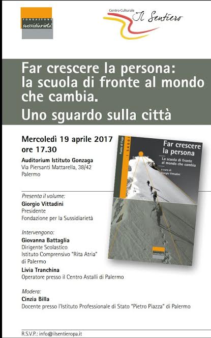 L’iniziativa, promossa dal Centro Culturale “Il Sentiero” di Palermo, prende spunto dalla pubblicazione del volume “Far crescere la persona”, curato tra gli altri dal Giorgio Vittadini, Presidente della Fondazione per la Sussidiarietà che sarà presente all’iniziativa e intende proporre un confronto sul tema della scuola, con particolare riferimento alla situazione palermitana. Sono stati infatti invitati a parlare, Giovanna Battaglia, Dirigente Scolastico dell’Istituto Comprensivo “Rita Atria” di Palermo, e M. Livia Tranchina, operatore presso il Centro Astalli di Palermo. Modererà Cinzia Billa, docente nell’Istituto Professionale di Stato “Pietro Piazza” di Palermo.