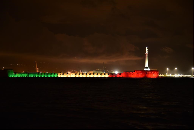 Colpo d’occhio a Messina dove la marina militare illumina con il tricolore il forte del bastione di San Salvatore.