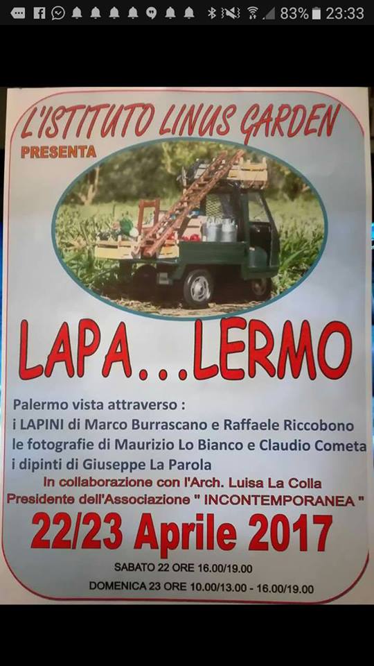 Domani e domenica, 22 e 23 aprile, all’Istituto Linus Garden 2 (via Pietro Marcellino Corradini 24), a Palermo, ci sarà ‘Lapa…lermo’, mostra di splendidi modelli di ‘lapini’ tipici siciliani, realizzati dai maestri Raffaele Riccobono e Marco Burrascano.