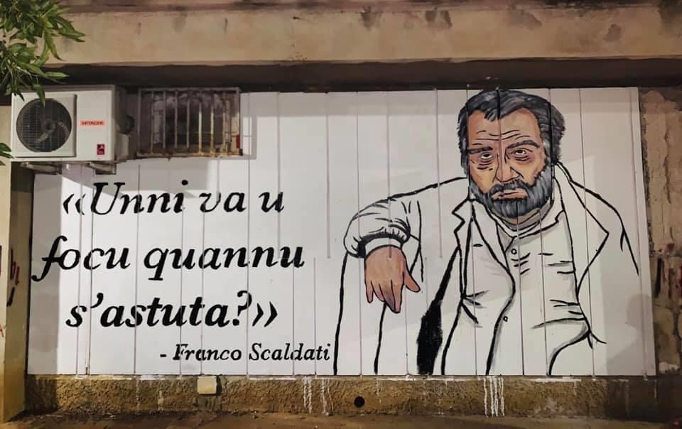 “Unni va u focu quannu s’astuta?”. Una parete all’interno dell’università degli Studi di Palermo è stata dedicata a Franco Scaldati. Un omaggio dei palermitani, firmato dal gruppo Facebook “No beni culturali alla Lega nord – Musumeci dimettiti” che conta 50mila siciliani in protesta contro la nomina del leghista Samonà ad assessore regionale alla cultura.