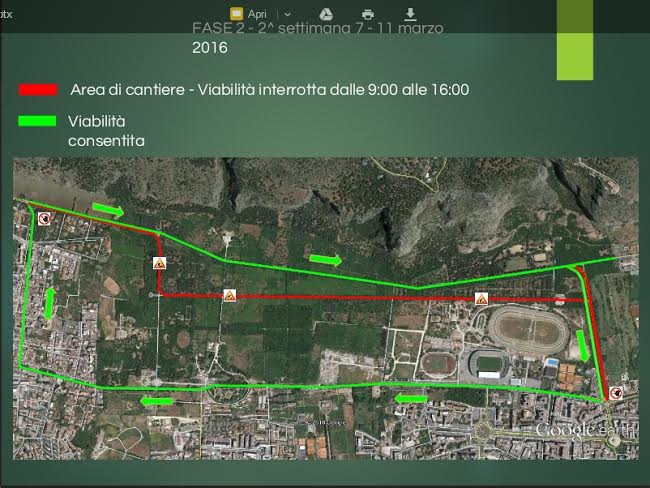 Per questa seconda fase dei lavori, che si concluderanno venerdì 11 marzo, è prevista la chiusura del traffico veicolare in viale Ercole dalle ore 9.00 alle ore 16.00. Tutte le autovetture in direzione Palermo e provenienti da viale Ercole, saranno dirottate su su viale Diana. Il transito da Palermo verso Mondello sarà assicurato attraverso Viale del Fante.