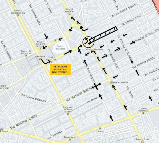 La circolazione stradale sarà garantita attraverso percorsi alternativi: da via Roma si potrà svoltare verso via Ammiraglio Gravina per percorrere via Wagner che cambierà senso di marcia e ritornare su via Roma verso piazza Sturzo. Parallelamente a via Roma, si potrà percorrere via Villaermosa per proseguire su via Wagner. Coloro che percorreranno via E. Amari da piazza Ruggero Settimo saranno obbligati ad immettersi in piazza Sturzo. Da via Roma per arrivare in via Crispi si potrà percorrere via Principe di Belmonte.