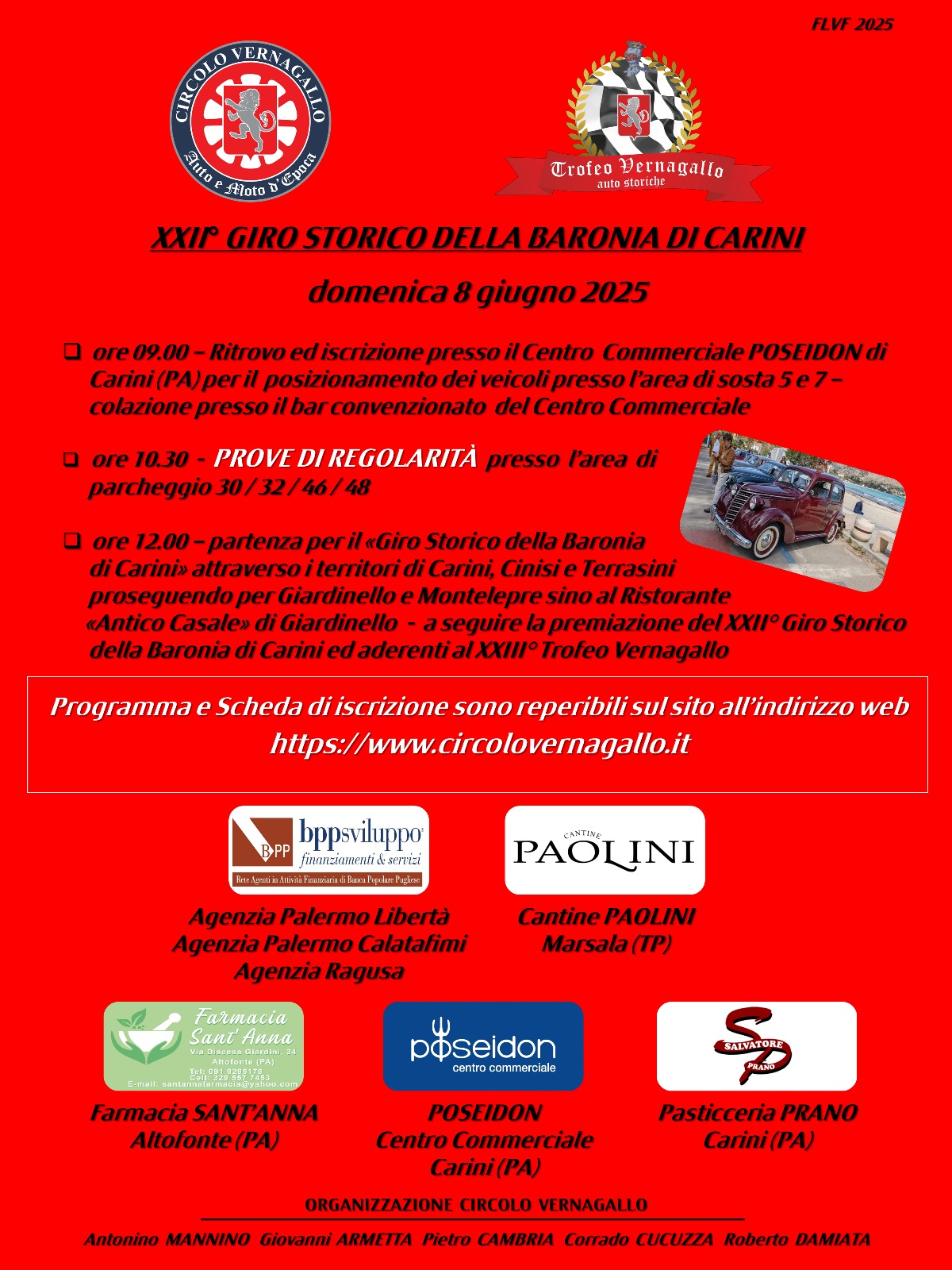 Il Giro Storico della Baronia di Carini precede tradizionalmente il Trofeo Vernagallo che nel 2025 taglia il traguardo della XXIII edizione e che, quest’anno, prevede un viaggio nei luoghi del Commissario Montalbano, tra le location più suggestive della Sicilia Orientale, dal 14 al 18 giugno.