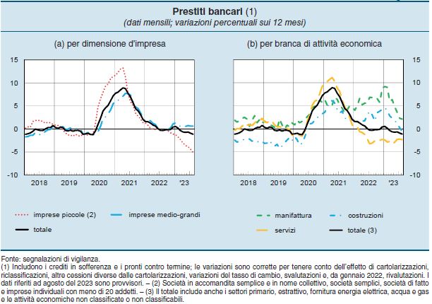 A giugno del 2023 il credito alle imprese si è ridotto dello 0,7 % rispetto a dodici mesi prima, risentendo dell’indebolimento della fase ciclica e dell’aumento dei tassi di interesse che ha scoraggiato la domanda di nuovi finanziamenti. La contrazione si è accentuata nei mesi estivi (-1,1 ad agosto). La flessione ha riguardato soltanto le imprese di minore dimensione, mentre per quelle medio-grandi il credito ha continuato a crescere sebbene in rallentamento rispetto all’anno precedente; per queste ultime, l’espansione dei prestiti è stata della stessa intensità rispetto a quella osservata nel Mezzogiorno, contro un calo a livello nazionale. L’andamento è stato differenziato anche tra settori di attività economica: a giugno, a fronte di un calo dei finanziamenti nel terziario, il credito è cresciuto nell’edilizia e nella manifattura; per questi ultimi due comparti si è comunque osservata una netta decelerazione rispetto alla fine del 2022.