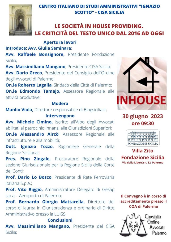 Il convegno sarà aperto dall’avvocato Giulia Seminara, insieme all’avvocato Raffaele Bonsignore (presidente della Fondazione Sicilia), l’avvocato Massimiliano Mangano (presidente Cisa Sicilia), il presidente dell’ordine degli avvocati in Sicilia, Dario Greco, il sindaco di Palermo Roberto Lagalla e l’assessore regionale alle attività produttive Edy Tamajo. Ci saranno gli interventi dell’ex presidente dell’Amat, l’avvocato Michele Cimino, che porterà una esperienza chiara di società in house nel settore dei servizi anche come legale, l’assessore regionale alle Infrastrutture Alessandro Aricò, il ragioniere generale della Regione Ignazio Tozzo, il presidente della sezione giurisdizionale per la Sicilia della Corte dei Conti Pino Zingale, il presidente di Rfi Dario Lo Bosco, l’amministratore delegato di Gesap Vito Riggio, il professore Bernardo Giorgio Mattarella, direttore del corso di laurea in Giurisprudenza e ordinario di diritto amministrativo presso la LUISS. Conclusione dei lavori affidata a l’avvocato Massimiliano Mangano. Modera il convegno Manlio Viola, direttore di blogsicilia.it.
