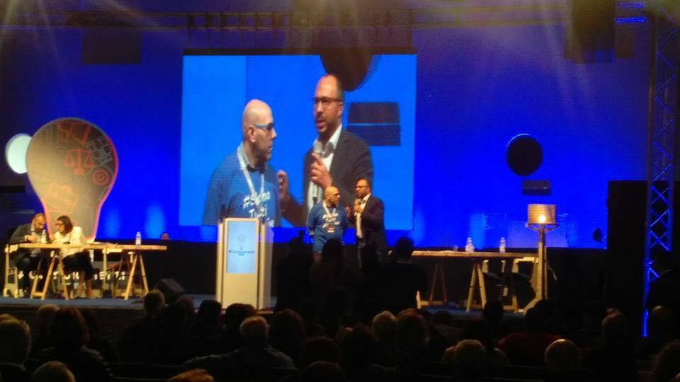 Una delegazione di lavoratori ha letteralmente fatto irruzione, in modo pacifico, interrompendo la Leopolda urlando “siamo tutti Almaviva” e mostrando cartelli.
