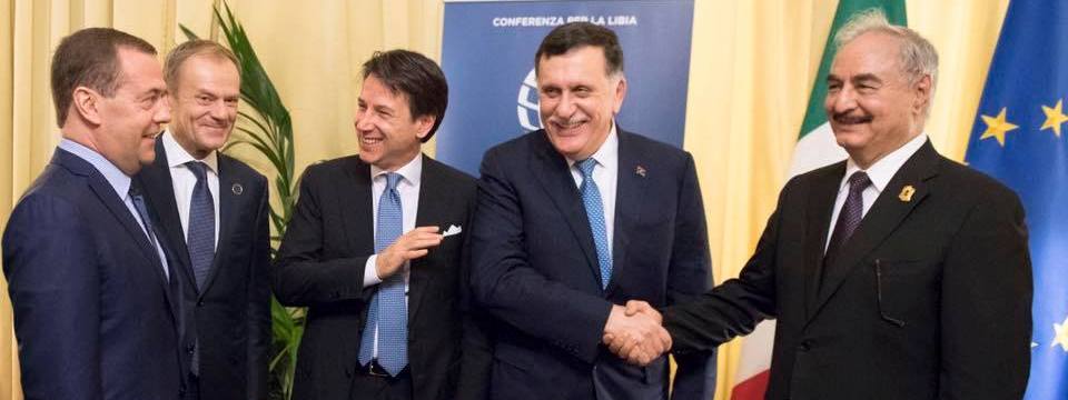 La foto che sugella il successo, sia pure informale. Il presidente del Governo nazionale libico, Fayez al Sarraj e il generale Khalifa Haftar sorridenti, che si stringono la mano con in mezzo il premier Giuseppe Conte che, con la sua mano, suggella il saluto tra i due leader rivali.