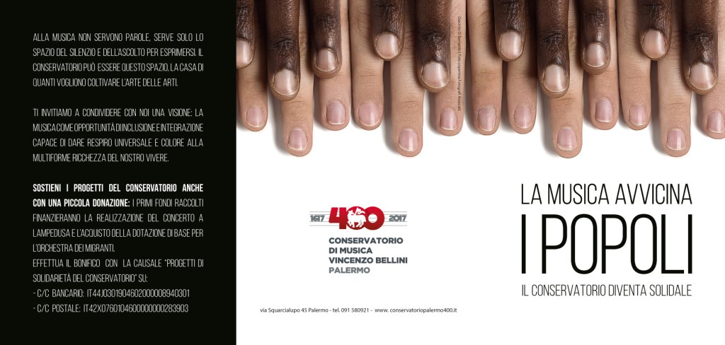 Nel solco del motivo che 400 anni fa diede vita all’istituto del Buon Pastore, il Conservatorio di Palermo rinnova il suo impegno per la solidarietà attraverso la musica, l’unica forma espressiva che permette di superare le frontiere attraverso un linguaggio comune.