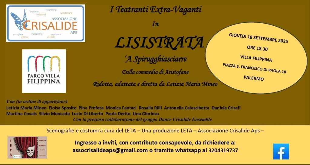 Giovedì 18 settembre 2025 ore 18,30 al Parco di Villa Filippina a Palermo, i Teatranti Extra-Vaganti dell’Associazione Crisalide Aps metteranno in scena una riduzione della celebre commedia greca “Lisistrata” di Aristofane, riadattata in dialetto siciliano.