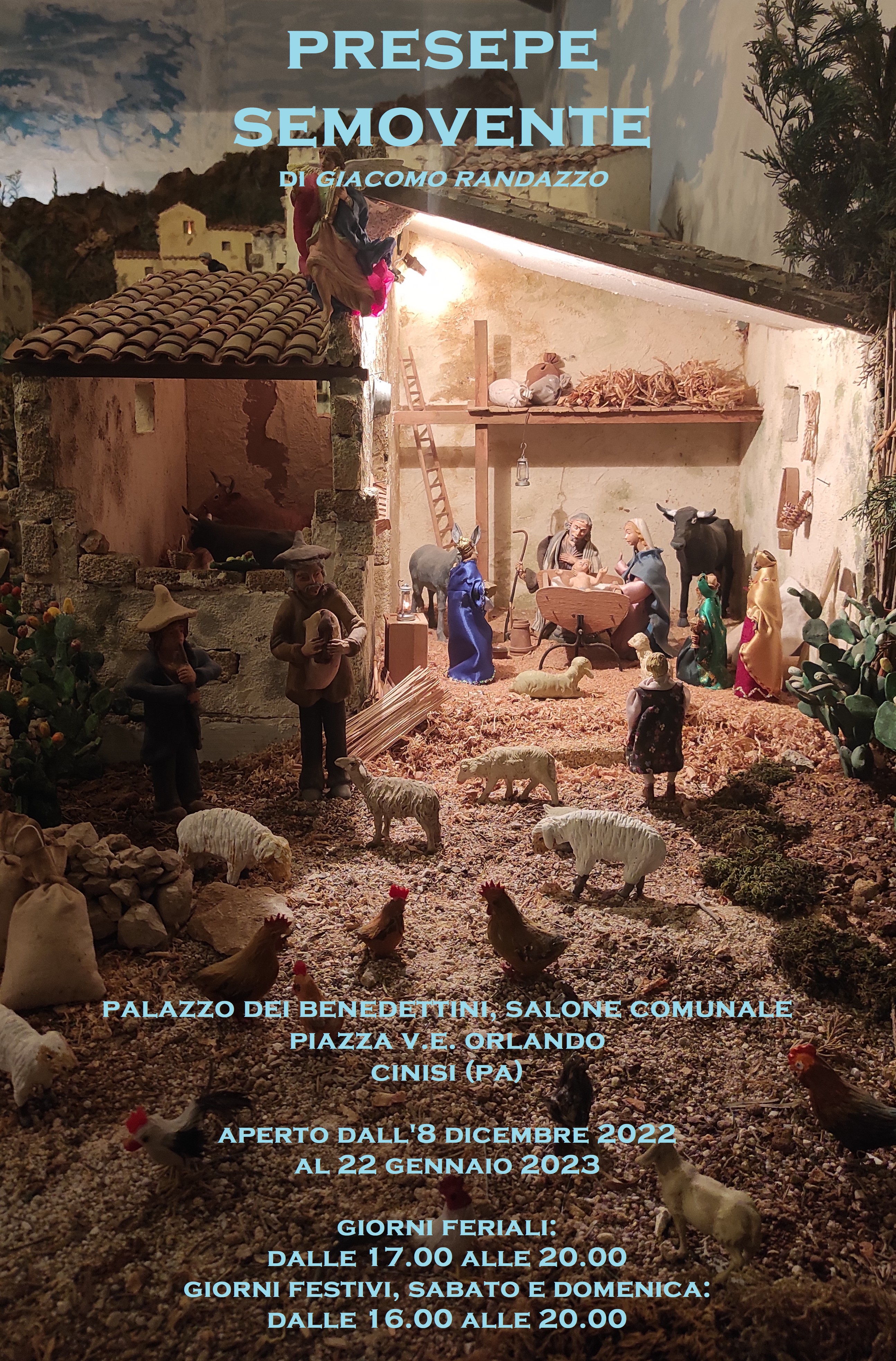 Ritorna il presepe semovente dell’artista Giacomo Randazzo a Cinisi, nel Palermitano, una delle attrazioni natalizie tra le più importanti del comprensorio. Un’opera unica nel suo genere perché rappresenta arti, mestieri e tradizioni siciliane in miniatura, in scala 1:10, ricco di particolari miniaturizzati e personaggi semoventi meccanizzati. Parliamo di un’opera che è stata inserita nel Reis, il “Registro delle eredità Immateriali”, nel libro delle espressioni dal 12 marzo 2007. Il registro nacque per volontà della Regione Siciliana, per la salvaguardia del patrimonio culturale dell’umanità secondo le indicazioni dell’Unesco. Il presepe si trova al palazzo dei Benedettini, nel salone comunale, in piazza Vittorio Emanuele Orlando. Sarà aperto dall’8 dicembre al 22 gennaio prossimo, nei giorni feriali dalle 17 alle 20 e nei giorni festivi, sabato e domenica, dalle 16 alle 20. È possibile visitare il presepe anche su prenotazione, chiamando al 3496331968 o scrivendo una e-mail a ass.arteetradizione@gmail.com.