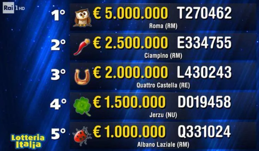 Nel Nord Italia altri due dei premi di prima categoria e in particolare a Quattro Castella in provincia di Reggio Emilia è andato il biglietto che vale il terzo premio, quello da 2 milioni di euro, mentre il quinto premio che vale 1 milione è andato ancora in provincia di Roma e in particolare a Albano Laziale.