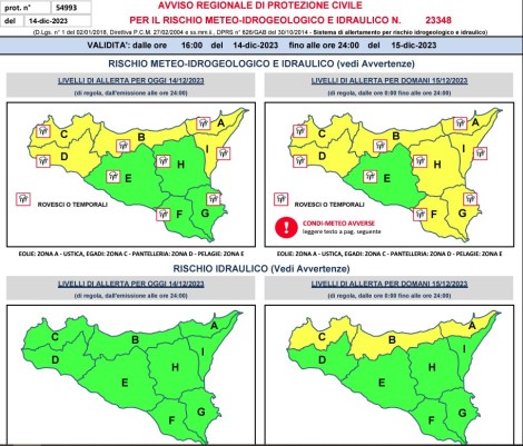 La nota, valida dalle 16 odierne fino alla mezzanotte di venerdì 15 dicembre indica allerta gialla in 5 province: Palermo, Catania, Messina, Trapani ed Agrigento.