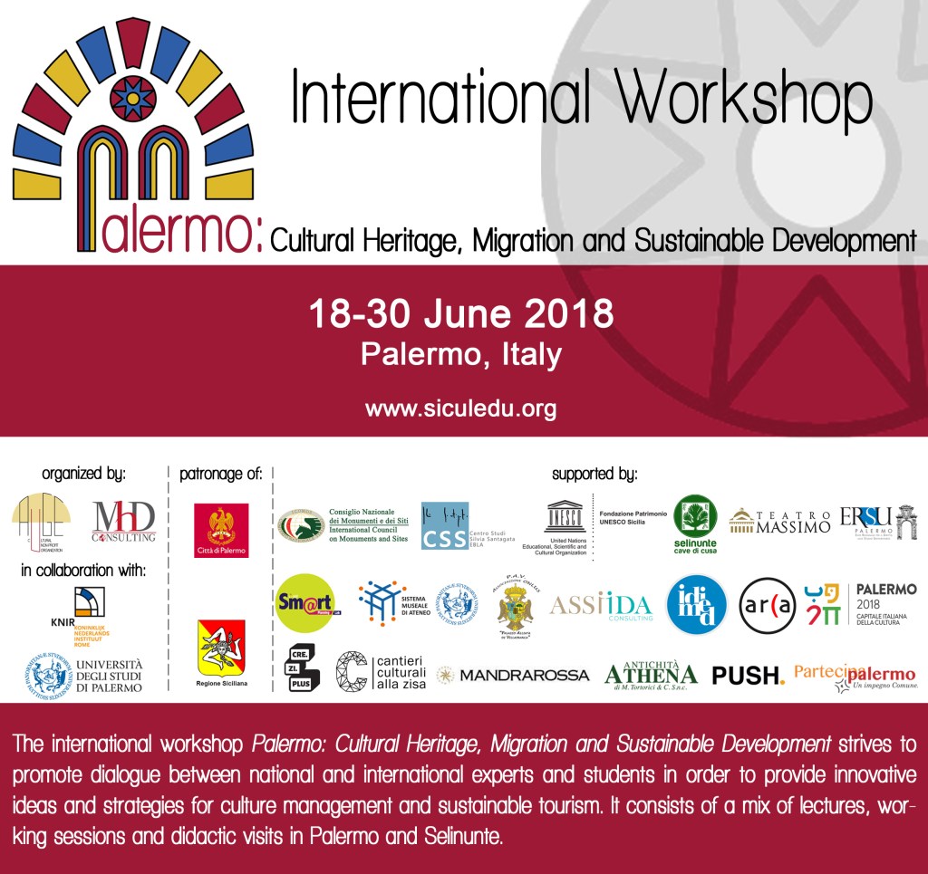 Scade il 30 aprile il termine per presentare le domande di partecipazione al workshop internazionale che si svolgerà a Palermo dal 18 al 30 giugno 2018 dedicato a “Palermo: cultural heritage, migration and sustainable development” (www.siculedu.org) organizzato dall’associazione culturale AUGE e dall’Agenzia di Cooperazione Internazionale in ambito culturale MhD Consulting.