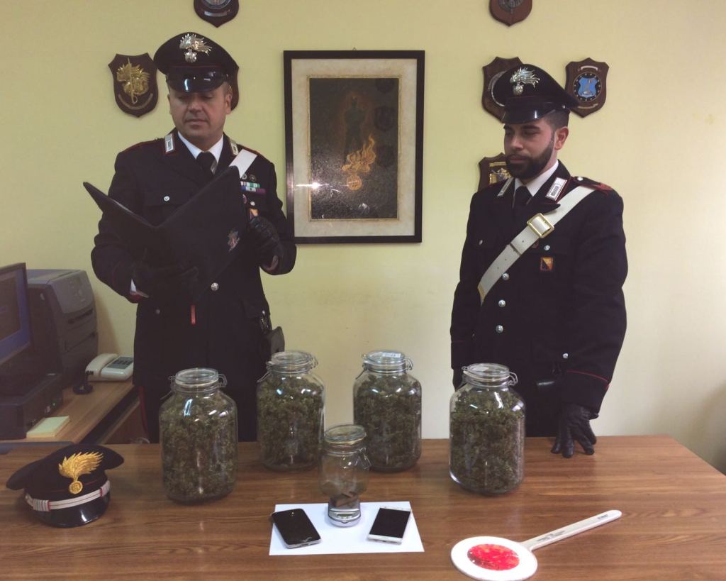 In casa di Tarantino i militari hanno trovato 4 contenitori in vetro, con 710 grammi di marijuana, 25 grammi di hashish ed un bilancino di precisione.